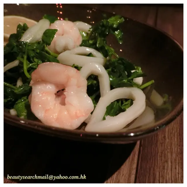 前菜先來一碟 Seafood Salad,有別於平常的沙律菜,「海鮮沙律伴茴香及青檸汁」選用了西洋菜代替傳統的沙律的菜,再搭配魷魚、中蝦等,味道清甜,唯海鮮選擇不多,份量亦屬輕量,感覺未夠豐富。