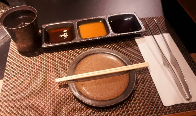 桌上已經放置了三款的醬汁 - 燒肉豉油、麵豉、酸汁