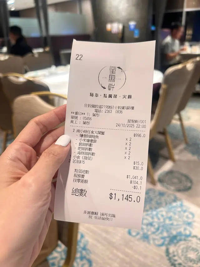 呢個大閘蟹放題優惠真係好吸引!😌 店裡除咗大閘蟹放題,仲有中式私房菜,價位適中,手工點心即叫即做,保證新鮮美味!而且,佢距離佐敦地鐵站好近,交通方便,適合同朋友或者家人聚餐。總括而言,佐敦星聚軒真係一個值得一試嘅好地方!