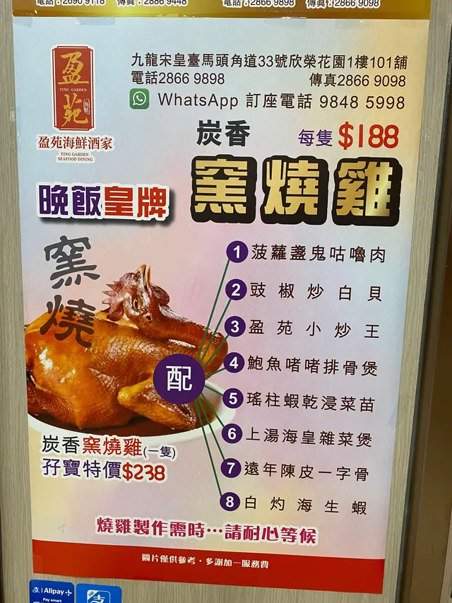 超正原隻爆汁脆皮窯燒雞🔥 lazymulifeLevel 42024-10-22274 views Follow 土瓜灣有唔少中菜選擇🍚 但有得食窯燒雞嘅酒樓就好難搵到🧐 今次嚟到開業冇耐嘅盈苑嘆傳統特色中菜🤤一隻窯燒雞配一款指定小菜,孖寶特價優惠$238,份量十足🙌🏻#香港美食 #窯燒雞$188炭香窯燒雞🍗原隻雞用荔枝柴窯燒,為咗保留肉汁同埋熱度🌡️ 師傅專登原隻奉上,先用鉸剪將兩隻翼剪開✂️ 然後再食雞髀,食嘅時候可以點埋流出嚟嘅雞汁一齊食🤭 食到肉質鮮嫩之餘,仲原汁原味添😋菠蘿盞鬼咕嚕肉菠蘿盞鬼咕嚕肉🐷叫得盞鬼當然唔少得油炸鬼,上碟時仲保留到油炸鬼脆度,而且仲掛到汁,唔會因為有汁而腍晒👍🏻 咕嚕肉充滿肉味,脆漿夠簿身,唔會俾粉漿掩蓋豬肉同咕嚕汁嘅甜味😌卜卜脆腩仔$73瑤柱蝦乾浸菜苗$98121The above review is the personal opinion of a user which does not represent OpenRice's point of view.LikeShare超正原隻爆汁脆皮窯燒雞🔥 盈苑海鮮酒家 https://s.openrice.com/QrKT0Nv9N00Report Post Ratings5Taste5Decor5Service5Hygiene5ValueRecommended Dishes炭香窯燒雞$188卜卜脆腩仔$73菠蘿盞鬼咕嚕肉瑤柱蝦乾浸菜苗$98Waiting Time10 Minutes (Dine In)Type of MealDinner