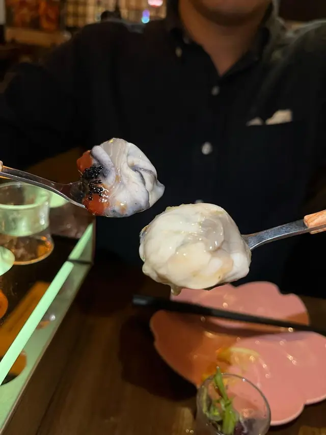 見到餐牌的本月推薦{海產細味六杯蠔} 六隻SHOT杯分別裝住三種口味的生蠔,超吸引!