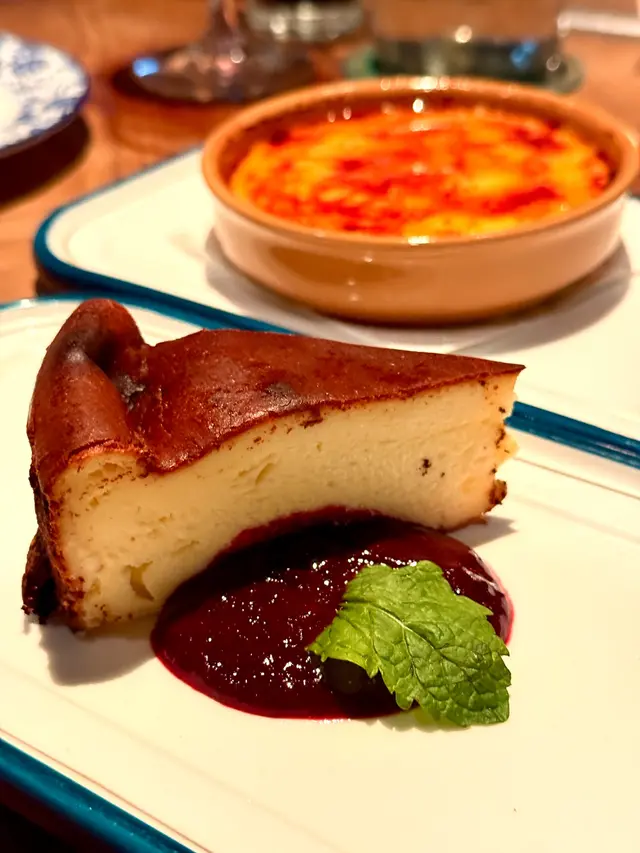 另一個甜品是巴斯克芝士蛋糕,表面帶深棕色,有輕微苦甜焦糖味,但內裏柔軟濕潤,入口即化,奶香味濃郁,配上帶微酸的野莓醬,平衡芝士蛋糕的厚重。