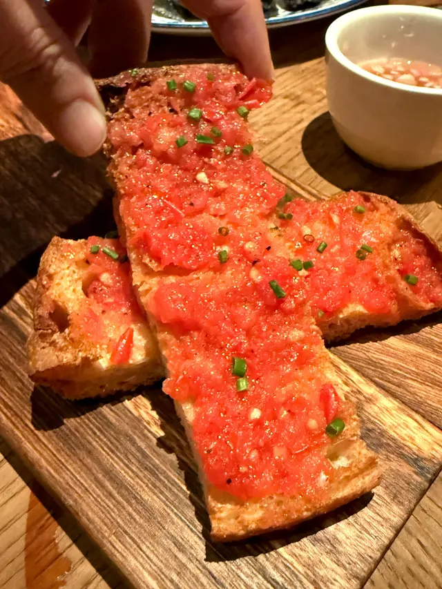 西班牙的傳統前菜,簡單在烘過的麵包上塗滿新鮮的蕃茄,再加上初榨橄欖油,簡單但超美味,香脆又充滿蕃茄香甜味。