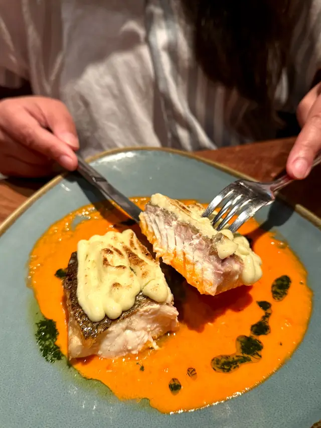 香煎海鱸魚配上紅燈籠椒的醬汁,帶出海鱸魚的鮮甜味,魚肉柔軟細膩。