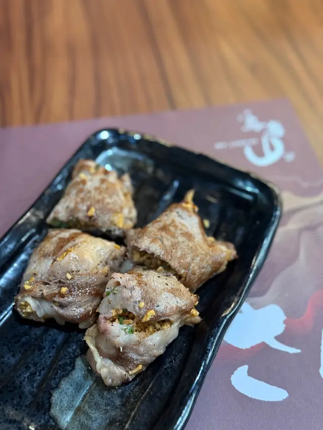 精選牛肉薄片,喺鐵板上快速燒熟,捲入炸蒜片或京蔥,牛味濃郁,肉汁豐盈。