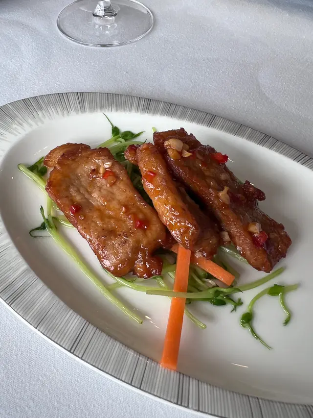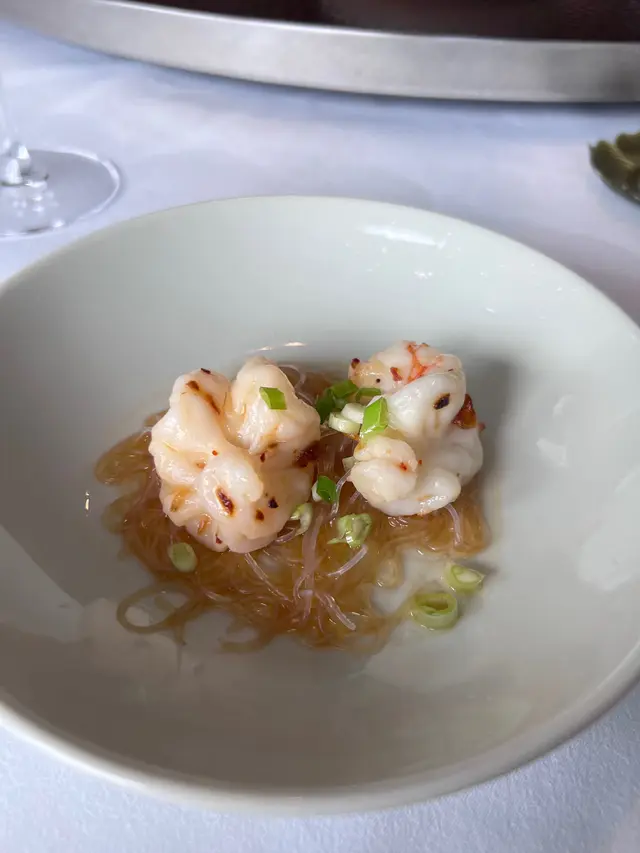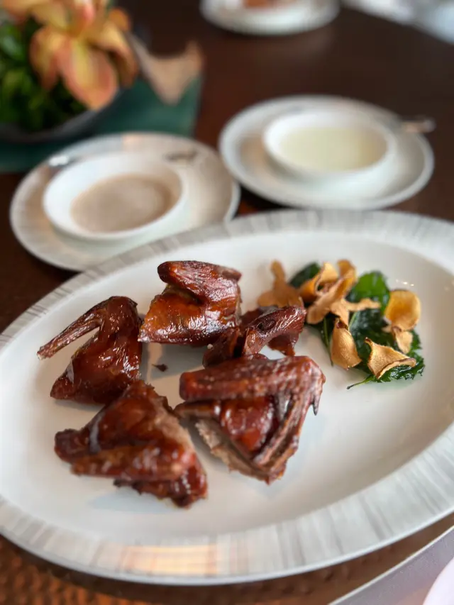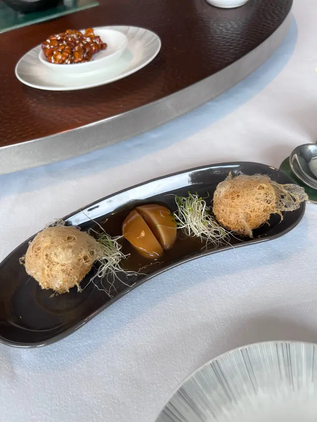 廚師點心拼盤是我最喜歡,特別是原隻鮑魚海鮮脆芋盒,外脆內鮮,口感層次分明,接下來的是紅菇菜膽湯,清淡可口,恰到好處。之後還有椒鹽黑豚肉、XO醬粉絲蒸蝦球的鮮味和榨菜火鴨絲撈蝦籽麵的獨特風味更是讓人回味,特別是撈麵的口感滑順,十分過癮。