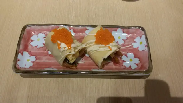 薄薄的雞蛋班戟內包有 香煎蜜味鰻魚件,厚片 牛油果,蟹柳和蛋,班戟面層加上新鮮魚仔粒,吾錯😋