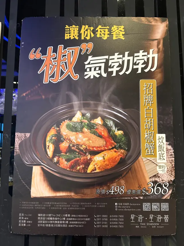 酒樓吃晚飯@the.starview,點咗呢度嘅招牌白胡椒肉蟹焗飯和遠年陳皮脆皮燒鵝都好有驚喜。蟹用煲仔上枱🦀一揭開蓋就香氣撲鼻,拆咗殼拎住個大蟹鉗吃超正,蟹底的焗飯也一樣美味🤤🤤 燒鵝整得皮脆肉嫩、夠juicy入味,墊底的陳村粉吸收了鵝油精華非常好吃👍👍👍