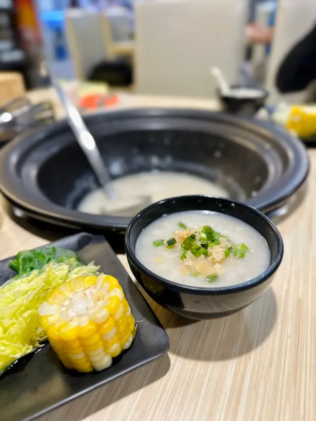 食曬啲海鮮,店員會用煲底保留嘅海鮮精華煮粥😍原來啲飯一早擺咗係個煲底,仲有豬骨,粟米,好鮮甜啊👍🏻 因我朋友唔食蔥同菜埔,店員好細心幫我哋另上。