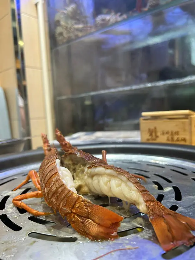 第一款吃的是加拿大野生大赤蝦,姨姨介紹時提到可以直接當作刺身吃。放進蒸籠前,蝦身還在扭動,可見非常新鮮。 蝦肉鮮甜,蝦頭膏香濃郁。再來的是台灣花尾龍躉片,肉質十分豐腴,蒸完後有奶白色的魚汁,啖啖肉,多汁嫩滑。