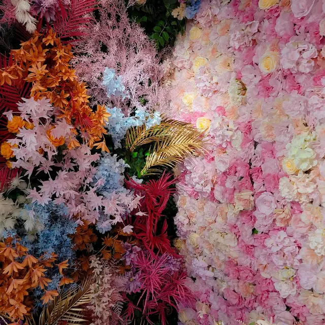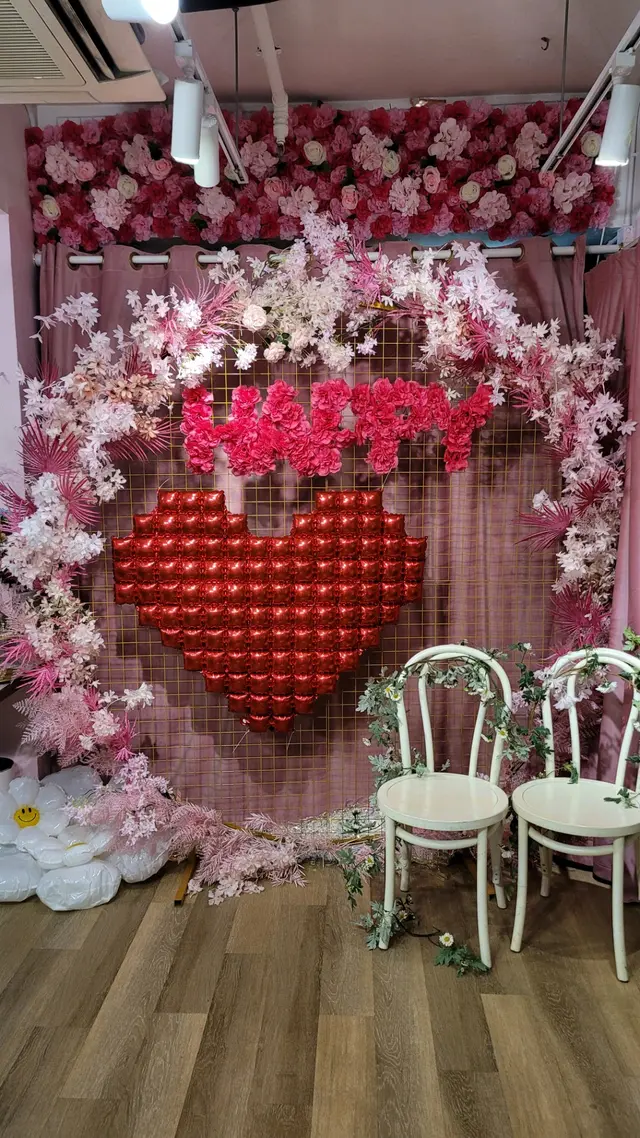 餐廳周圍佈滿不同類型的花, 門口右邊有一個大花圈, 中間包住一個大心心, 另外有一隻巨大粉紅色的獨角獸坐在餐桌前, 側旁有兩個鳥籠, 客人可以選擇這個特別的位置用餐。