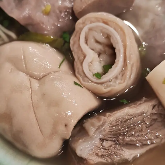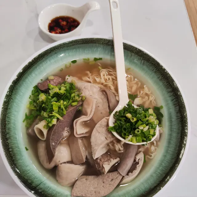 足料豬什皇加辣胡椒湯公仔麵:加辣胡椒湯底喝下去能瞬間暖胃,濃郁的湯頭與胡椒的辛辣完美結合,卻不嗆喉,麵中鋪滿了足料的豬雜皇,包括豬肝、豬肚、豬腸等,每種內臟都處理得乾淨且口感爽脆彈牙,搭配煮得彈牙的公仔麵簡直一流享受!😄😄😄