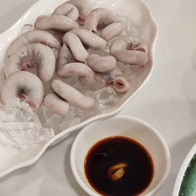 冰鎮豬生腸:豬生腸經過細心處理和灼熟後,立即用冰塊鎮涼。這種快速冷卻的處理方式,使得生腸的口感變得極度爽脆,咬下去發出令人愉悅的聲響。冰鎮後搭配芥末醬油入口,能突顯其本身的清甜和爽口,有效地解除了油膩感!👍👍👍