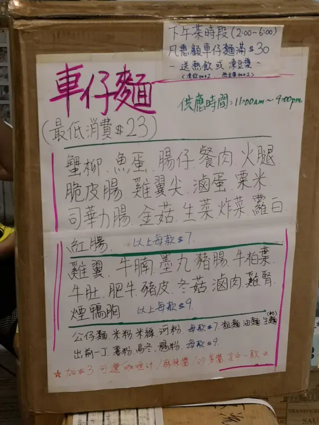 車仔麵 Fay HoLevel 12018-07-04252 views Follow 這間的車仔麵有童年味道,又開得夜,10點半都買到野食。大腸是我最愛,牛腩,雞翼,辣魚蛋都好入味。除左車仔麵,腸粉,魚肉燒賣都好正,由早到晚都可買到。腸粉加全醬後又係舊時味道,可叫多豉油,夠豉油好味D。The above review is the personal opinion of a user which does not represent OpenRice's point of view.1Share車仔麵 食品宣言 https://s.openrice.com/QrKT0x28l00Report Post Ratings4Taste2Decor4Service3Hygiene3ValueDining MethodTakeAway