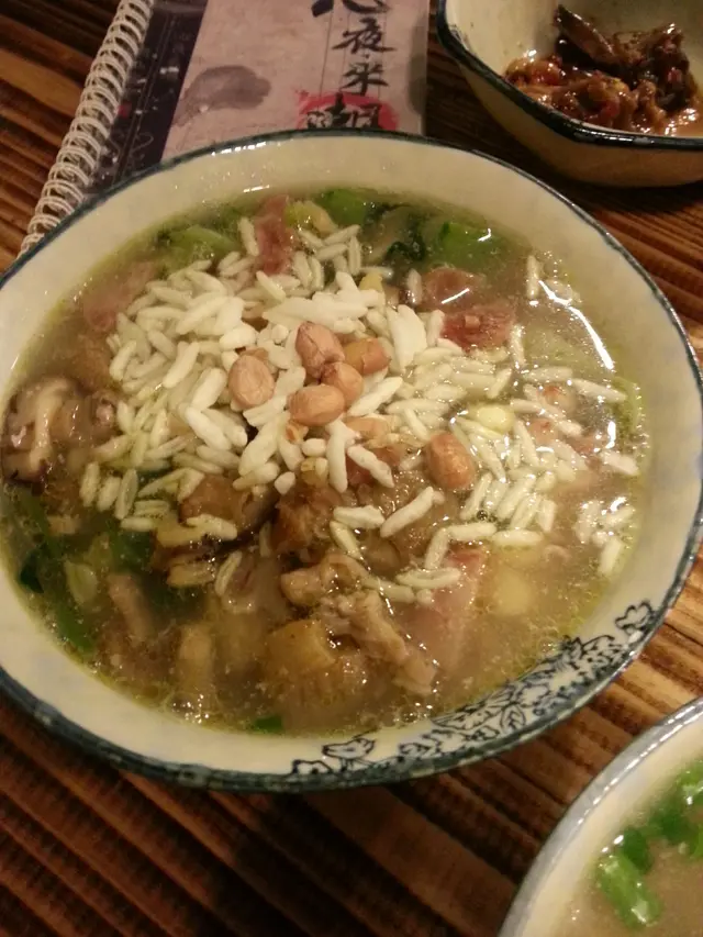 面上灑上脆米,一碗上湯,材料有花生,臘腸,菜乾,粉絲,蝦米,瘦肉,味道清淡,略缺鮮味,無想像驚喜,但感動清新。