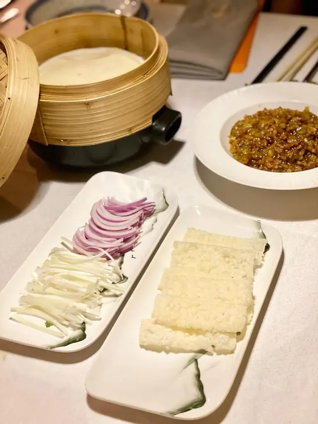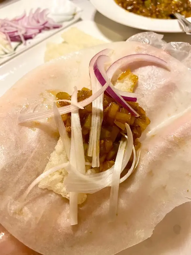 川辣生炒羊肉鬆拌荷葉餅是這裏的招牌菜,檯上卡特意介紹食用次序,先將荷葉餅放上鍋巴,再放紅洋蔥、京蔥等,最後再放上川辣炒羊肉,羊肉有微微羶香,微辣又惹味。