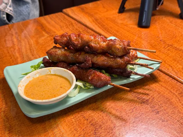 串燒有三款肉可以揀,分別係豬、牛、雞。今次揀咗豬雞各3串。燒得好香,食落又唔會太乾,配埋沙嗲醬食好惹味。