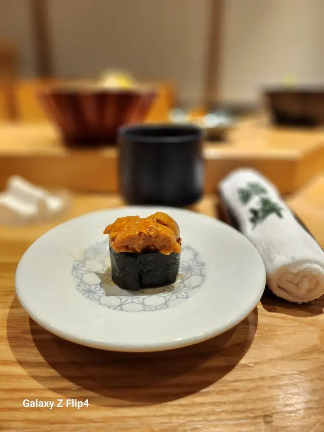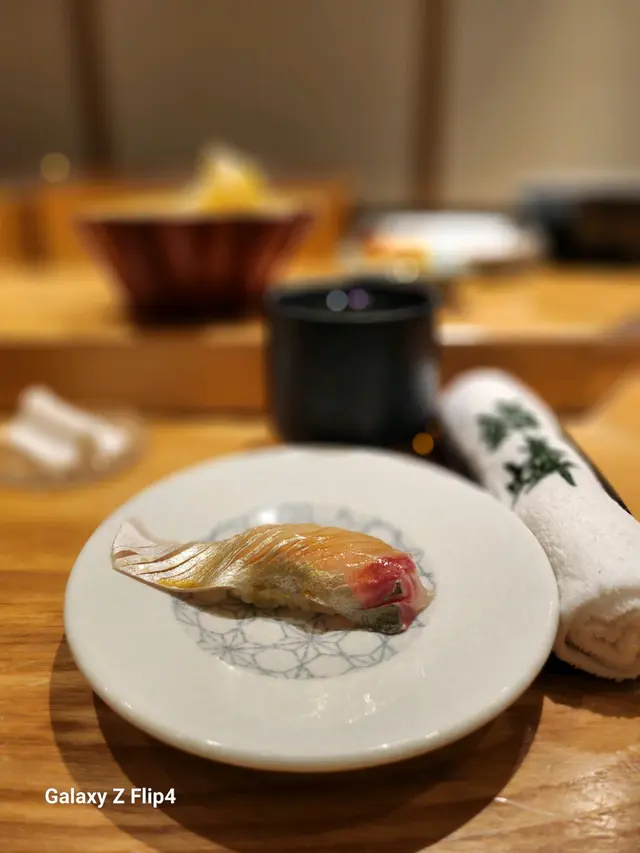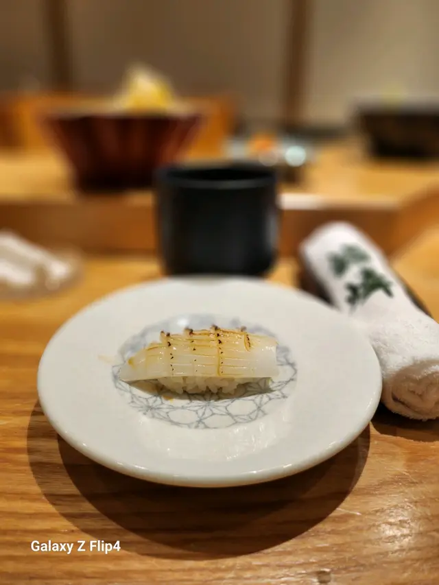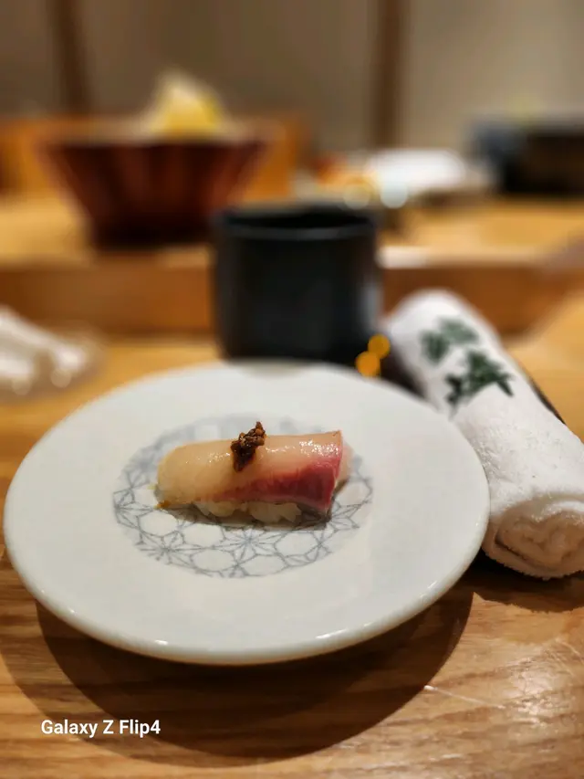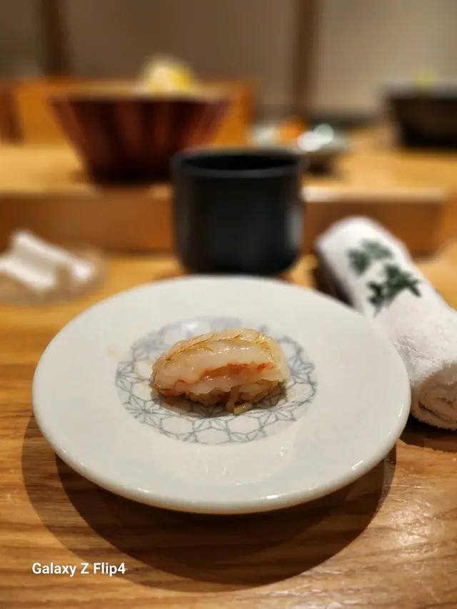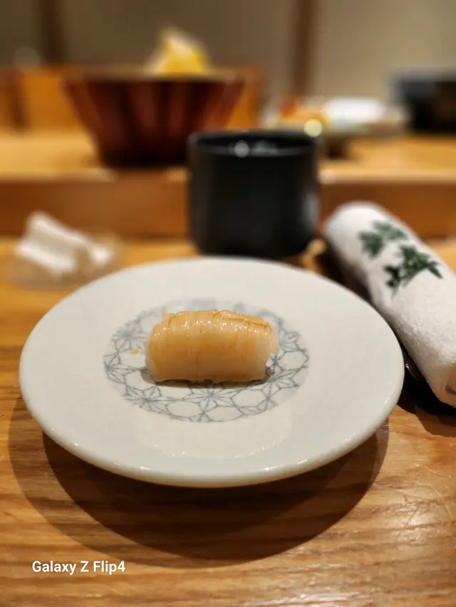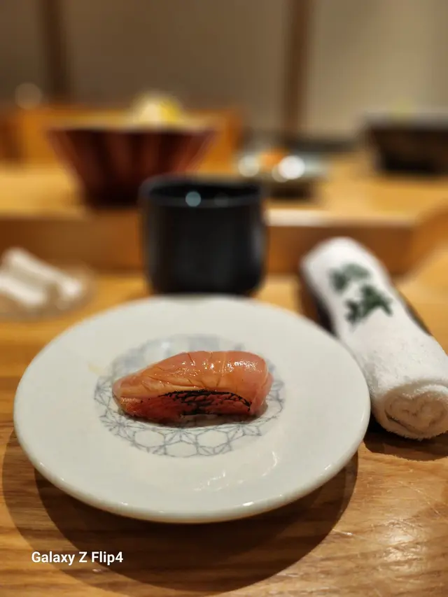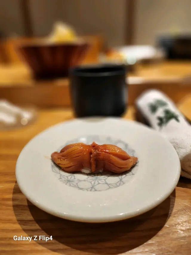 赤貝經過師傅拍打後貝肉收縮,肉質變得緊致爽脆加上壽司飯混和柚子皮碎,入口多了份清香