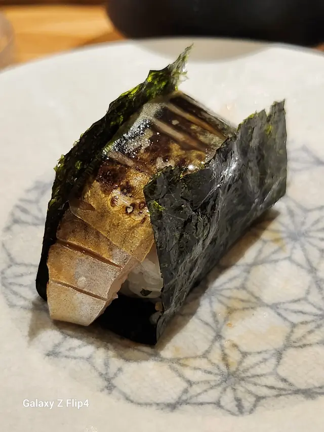 捲壓鯖魚壽司,鯖魚表面略燒過包裹着壽司飯和紫蘇葉及芝麻再捲壓而成,再配糖醋煮過的白昆布用紫菜包裹進食,風味獨特