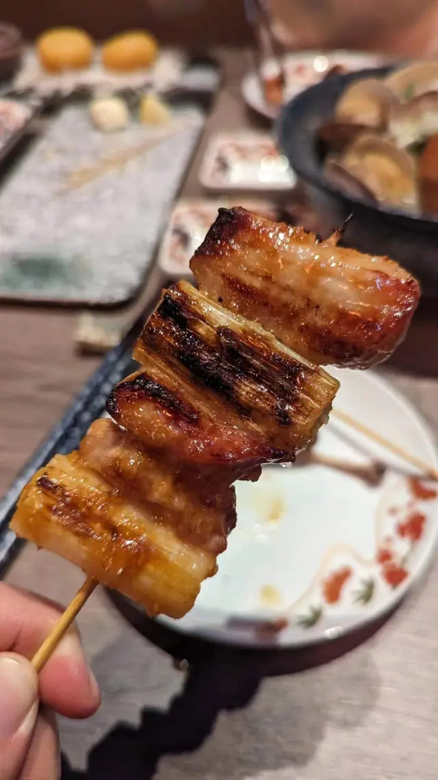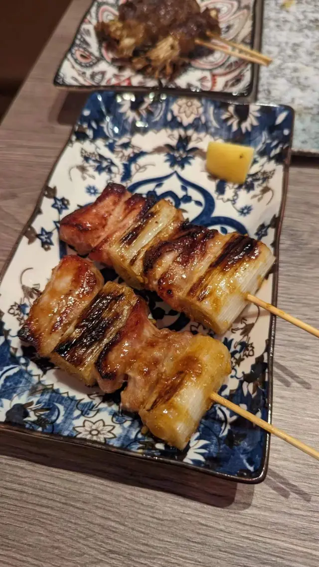 豬頸肉經燒烤後肉質鮮嫩,搭配大蔥香氣,形成一道香氣四溢的串燒。