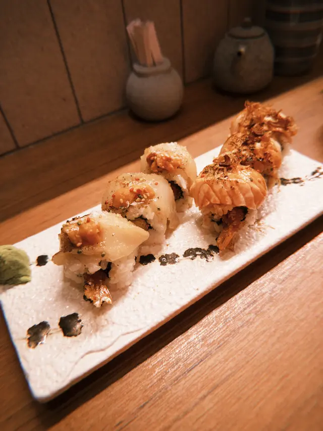 壽司方面,海膽右口魚天婦羅蝦,感覺好fresh同埋炸蒜片灼燒三文魚天婦羅蝦,兩款都好出色,食物層次分明,完全唔會膩,配搭得啱啱好!