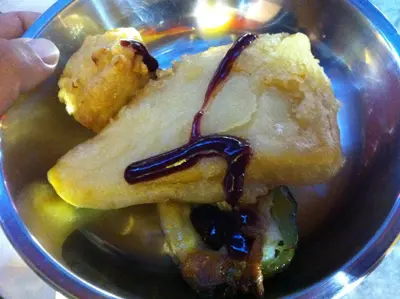 三寶的配搭每次也不同 ----- 有時是魚蛋、青椒加紅腸,另外間中也會吃飽肚一點的大片蕃薯或芋頭。味道總的來說不算很出眾,魚蛋有時吃至人一口"粉";青椒經翻炸後皮也皺了;芋頭則大多情況下是硬如石頭的:(;比較像樣的是紅腸,遇上即炸起後吃時,外脆內軟,尋回了兒時最喜歡吃這類大紅腸的感覺:)....