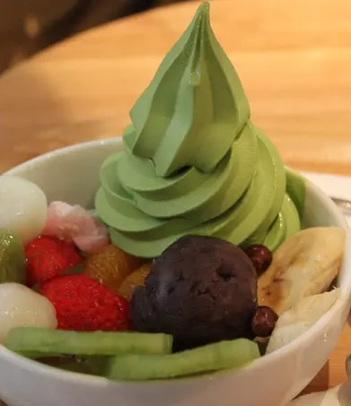 白玉抹茶雪糕,雪糕綠茶味好濃,濃得黎唔會太澀,雪糕質地都幾實,唔會好易溶,而且仲好滑。呢個時候食有d凍,不過冬天食先過隱。配既生果有奇異果、士多啤梨、香蕉、橙等。白玉好彈牙,好有口感。紅豆茸紅豆夠曬大粒,不過太甜喇。總體來講性價較高。