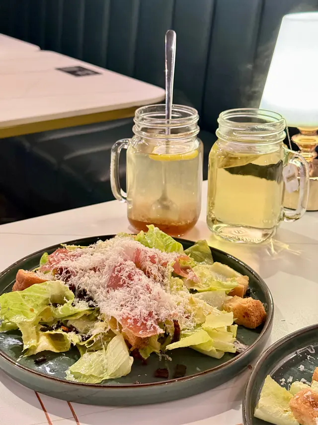 沙律菜清新脆嫩,凱撒醬帶點酸香,配上酥脆麵包粒、意大利巴馬火腿,層次豐富。