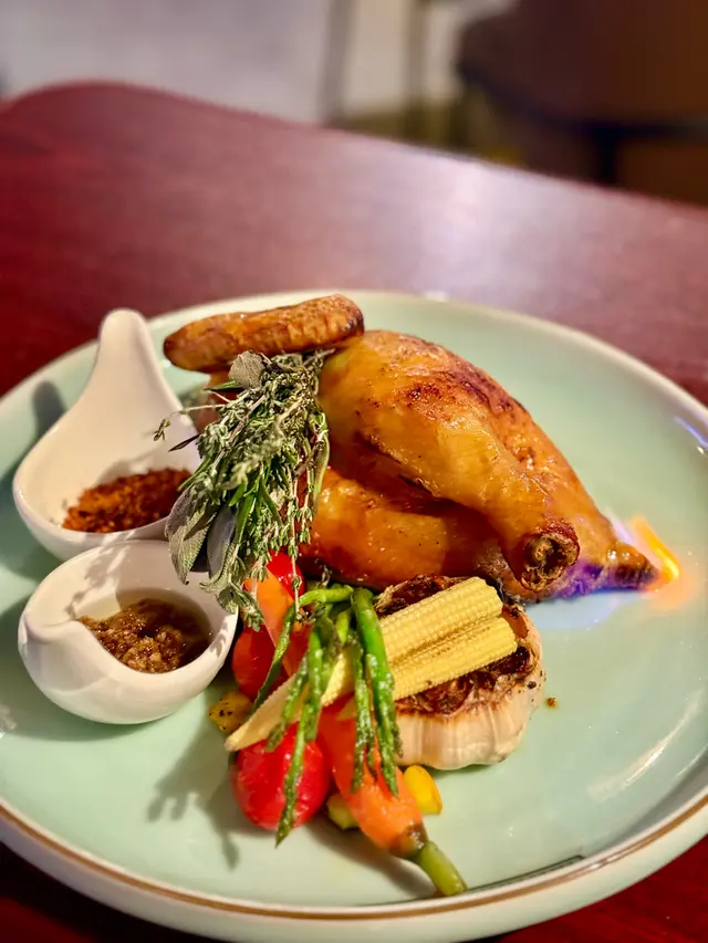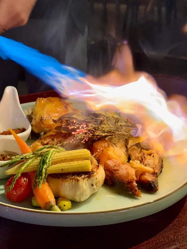 店員即場點火,打卡一流。外皮烤得焦脆,雞肉嫩滑多汁,而且香氣十足,調味恰到好處,令人回味。伴碟同樣有不少新鮮時蔬。