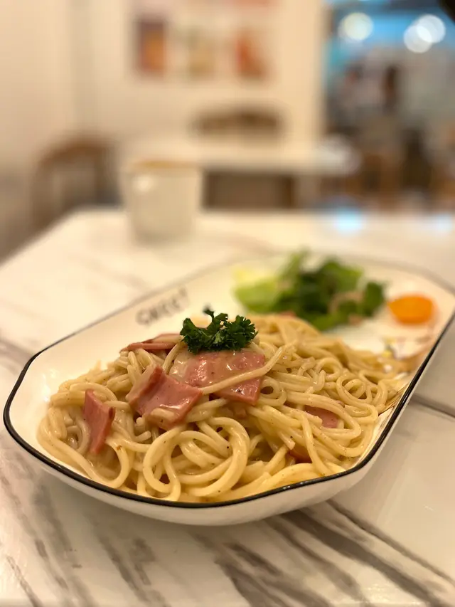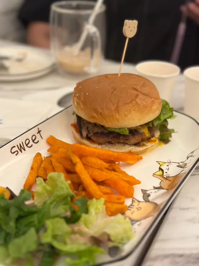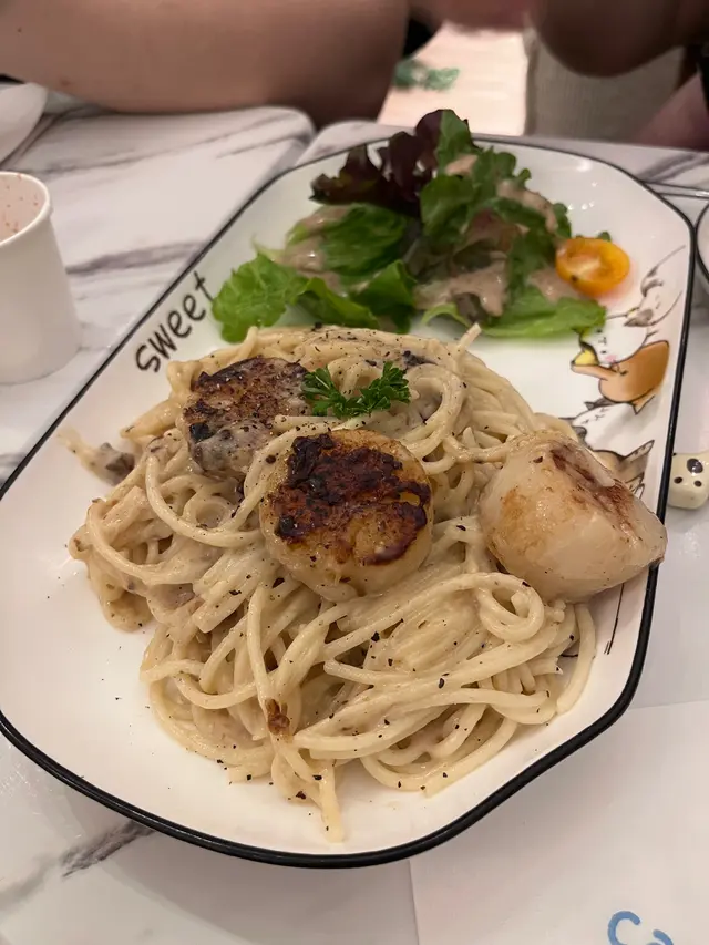除咗可以同貓貓互動之外,呢度嘅餐飲選擇都同樣出色。我哋嗌咗兩個意粉,其中一個係帶子意粉。意粉嘅質感完全唔會太soft,入口即化,配搭上帶子嘅鮮甜,真係冇得彈。另一個炸魚薯條就同樣咁出色,外層酥脆,而且裡面嘅魚肉又鮮嫩多汁。最後仲嗌咗一個漢堡,麵包香脆,襯托住好Juicy既肉餡。真係想講一句俾貓貓Cafe耽誤咗嘅餐廳。