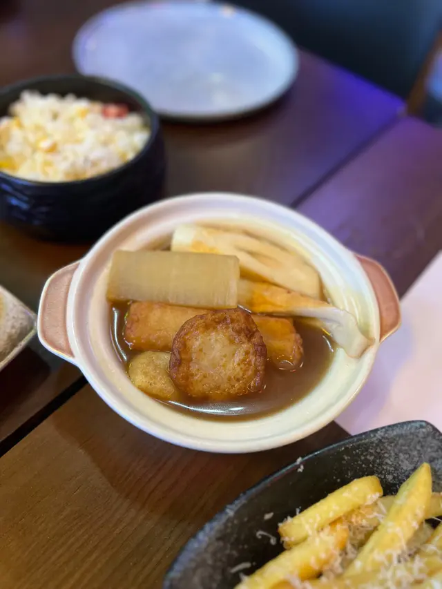🍲 啡色湯底清澈見底但唔淡而係有深度,滿滿嘅鮮甜味道。入面嘅蘿蔔切得粗厚實淨,吸滿湯汁卻保持脆口;魚餅彈牙有嚼勁,炸豆腐吸滿湯汁又夠軟熟。最驚喜係啲竹輪,夠香夠韌,感覺係手工製作而唔係工廠貨。湯底慢燉嘅功夫十足,晾咗幾耐都冇腥味,反而愈食愈香!