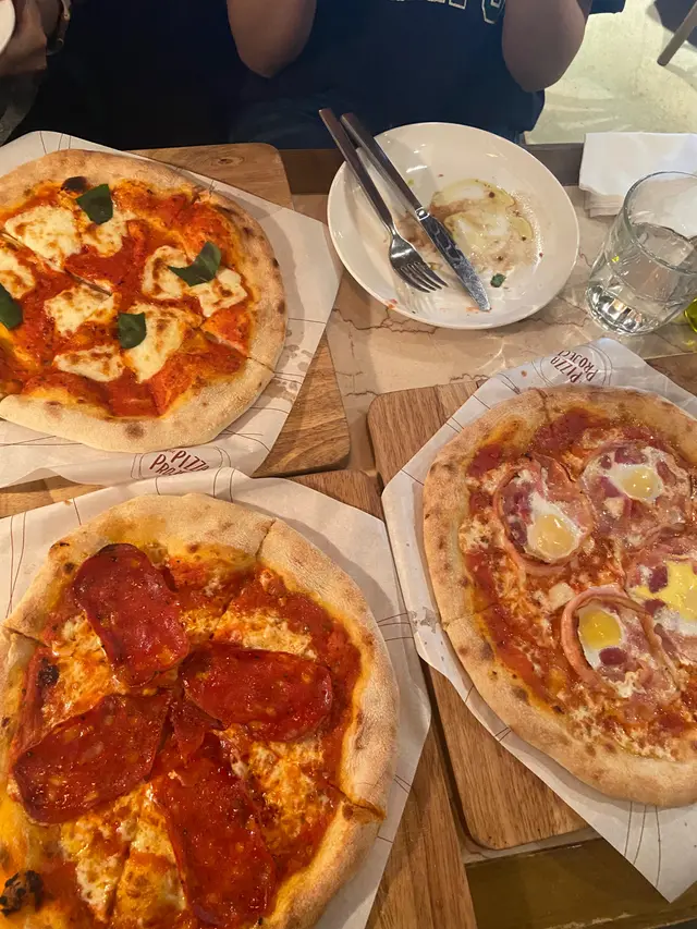 Margherita正常發揮,辣肉腸小小辣幾惹味,carbonara 有驚喜,每片pizza都有一粒蛋!