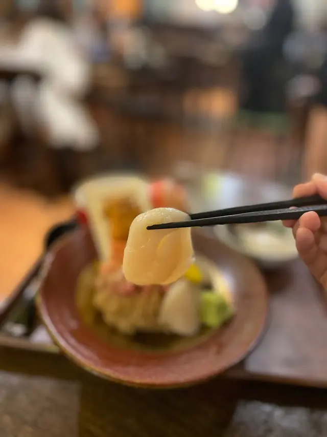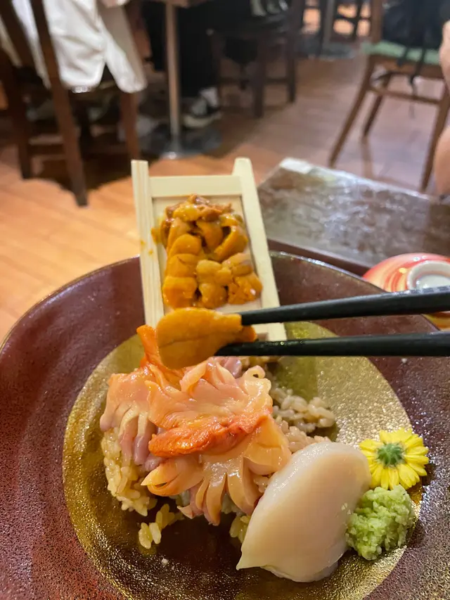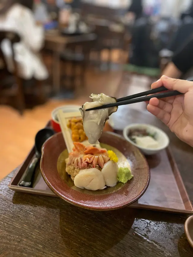 呢個丼飯有兩片珍寶帶子刺身,兩片活赤貝,生蠔🦪同埋馬糞海膽💕呢個珍寶帶子比起壽司嗰塊帶子更加新鮮,更鮮甜👍🏻而且真係好大塊,幾厚肉😋