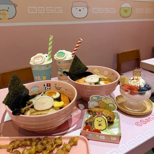 未行近已經見到門口嘅「角落生物」👾 全店粉紅色裝潢🩰 大公仔坐陣陪食拉麵🧸 連牆身餐枱、紙杯、食物都係角落生物主題,名副其實「生物遍佈每一個角落」🪤