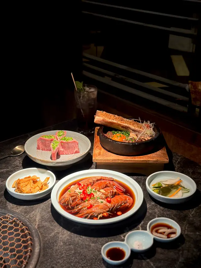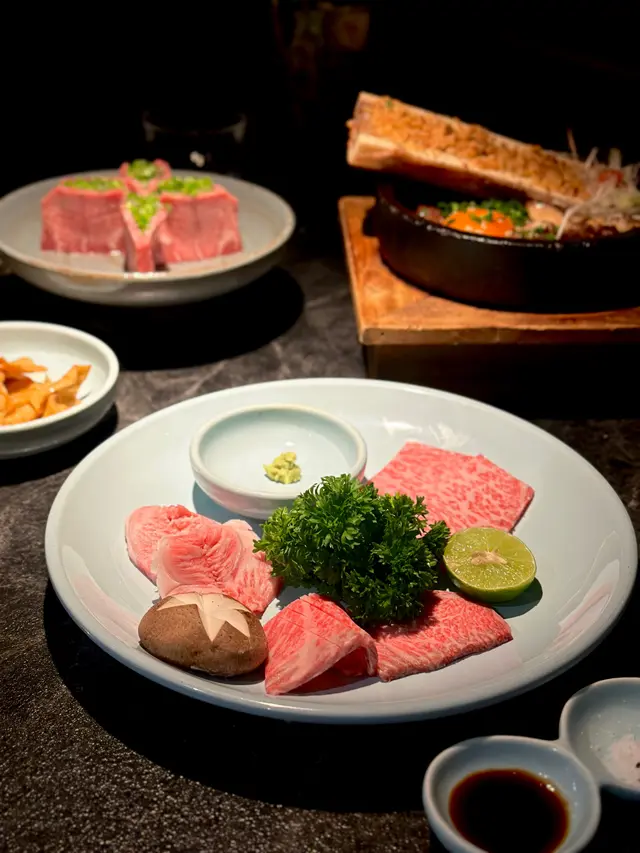 因為真係抵抗唔到和牛既吸引,所以喺韓國餐廳都要叫返份【日本產和牛肩肉盛】,一份有𝟑個唔同部位既和牛肩肉,三款都好重油脂香,每人𝟑塊真係啱啱好,再食多啲就食唔落其他野𝐥𝐮~