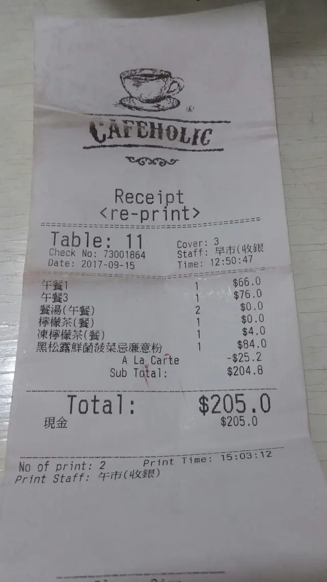 Cafeholic的食品味道及質素是值得稱讚的。可是,這次用餐經驗有一個很大的遺憾是侍應不小心把其他客人的食物打在我們的單內,我們沒有檢查就結帳了, 所以多給了80多元。真是有冤冇路訴
