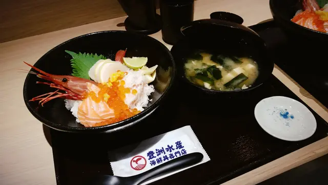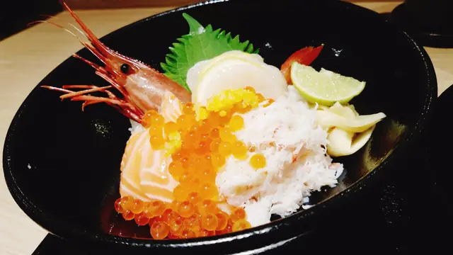 丼飯層次甚豐,三文魚子伴以柚皮,入口清爽,亦去其魚子原有的腥與鹹;帶子以檸檬片相隔,食前稍稍擠壓檸檬,讓帶子沾上檸汁,更顯清新;牡丹蝦佐以青檸汁,鮮味更顯。以丼飯來說,屬上乘之作,然海鮮甜度稍嫌不足,如以原價論,則稍有不值。