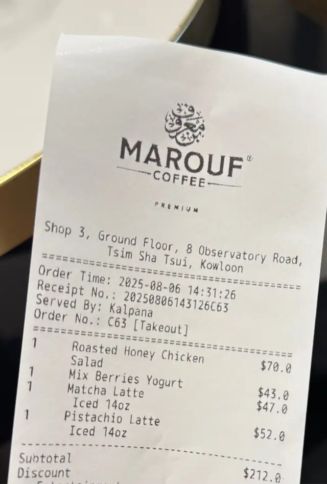藏身尖沙咀天文臺道靜街的Marouf Coffee,白色門面透著簡約質感。招牌雞胸沙律打破「健康即乏味」定律——炙烤雞胸嫩滑不柴,鋪滿羽衣甘藍與牛油果,淋上檸檬香草醬汁,酸爽開胃更帶堅果碎口感,輕食主義者必試。