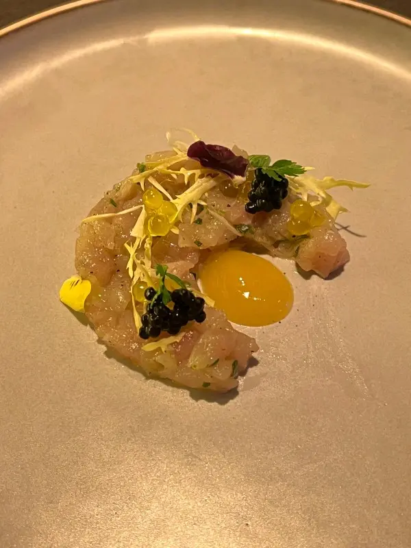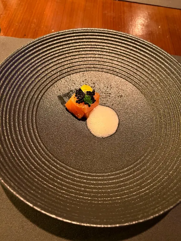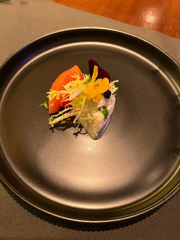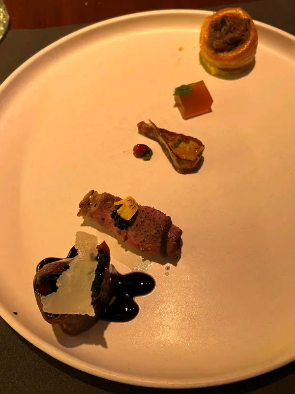 前菜以精緻擺盤為主,每一道都見心思。第一道是三文魚配魚子醬,鮮味突出,魚生質感細膩,配上泡沫醬汁添一分新鮮感。緊接是牛肉配黑醋汁,牛肉捲入蔬菜後外面鋪上芝士薄片,口感有層次,酸香帶甜。還有他們的特色小吃拼盤,每款分量雖少,但味道集中,特別是牛肉批,外脆內嫩,餡料濃郁。
