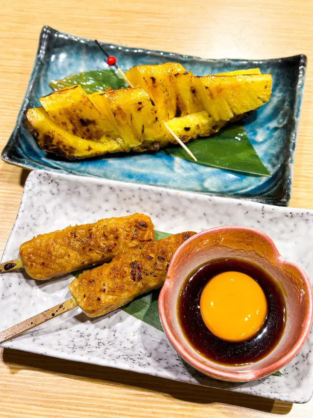我地隨心點左幾款串燒,估唔到味道都有驚喜。我地最推薦係雞肉軟骨棒,口感唔會太鬆太實,點埋蛋汁好鬼正,最最最緊要$48就有兩串,係抵到爛🤪🤪。豬頸肉調味相對比較重口味,易咬唔痴牙🤍最後用燒菠蘿做結尾,一啖咬落去爆哂汁,又甜又香🍍。