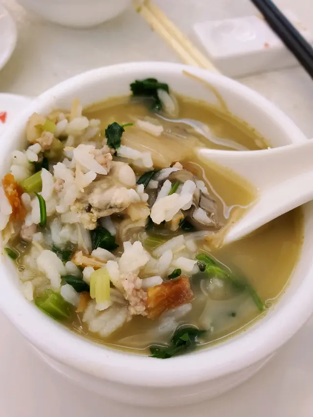 瑤柱肉鬆蠔仔泡飯, 材料有蠔仔、大地魚 、蝦乾及瑤柱,這4樣海產加起來已經鮮甜無比,還配上肉碎、芫茜、陳皮及唐芹,材料充足,真想再來一煲。