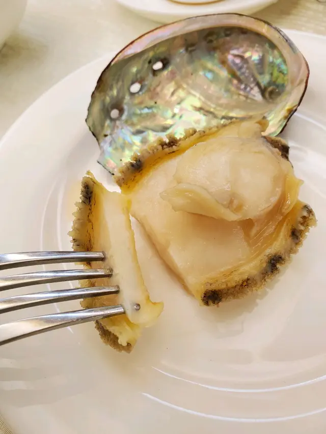 食物到來了:冰鎮鮑魚,厚肉,很鮮味,每隻size都很大,要用刀叉享用才夠高雅,配上有wasabi的醬汁,能帶出鮑魚的鮮味,十分匹配。😋