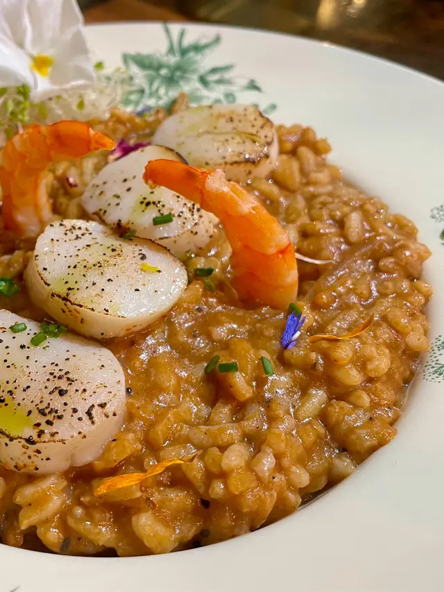 大澳虎蝦乾配北海道帆立貝龍蝦汁意大利飯,傳統意大利料理融合了香港特色。虎蝦乾味濃且富有嚼勁,搭配新鮮的帆立貝,香口又鮮味十足。米飯用上濃郁的龍蝦汁烹製,味道濃郁,米飯粒粒分明,帶來海洋的鮮美滋味。