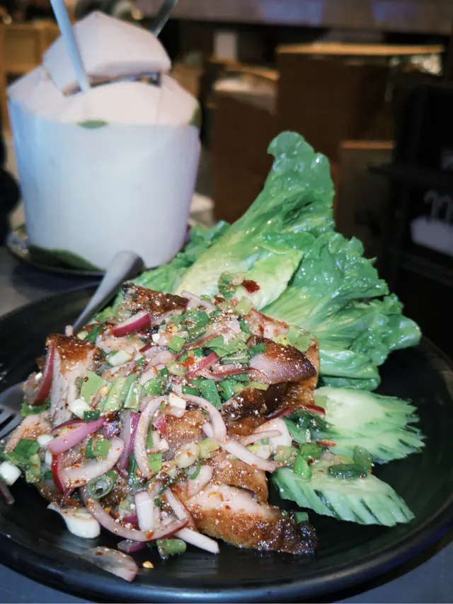 豬頸肉烤到個邊微焦的 個汁非常泰式酸醋辣辣的 配埋生菜🥬包住食好fresh 又惹味(❛◡❛✿)