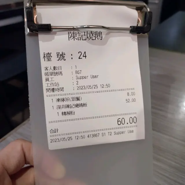 隻鵝無食飯,皮包骨,有圖有證據 110726hkLevel 32023-05-30631 views Follow 每次經過都比陳記燒鵝的大名吸引,今天終於來到一試。這店空間較少,只佔商場的小小位置,地下又是非常滑,要慢慢找個位置坐。來這裡當然就是試燒鵝啦,點了燒鵝瀨粉+凍飲$60,若果是有質素的燒鵝,這個價錢是很合理。一來到賣相還不錯,但夾起一件就知已中伏一半。份量還可以,但那隻鵝近乎沒有肉,只有皮,真正的皮包骨。第一次吃這種沒有肉,只有皮的鵝,很驚訝一間食店招牌菜是燒鵝,但只賣這種嚇人的級數。皮燒得有點脆,但食落很鹹。這些質素的燒鵝一次都不應幫襯。The above review is the personal opinion of a user which does not represent OpenRice's point of view.1Share隻鵝無食飯,皮包骨,有圖有證據 深井陳記燒鵝 (欣榮商場) https://s.openrice.com/QrKT07UH900Report Post Ratings1Taste1Decor2Service2Hygiene1ValueDate of Visit2023-05-25Dining MethodDine InSpending Per Head$65 (Lunch)