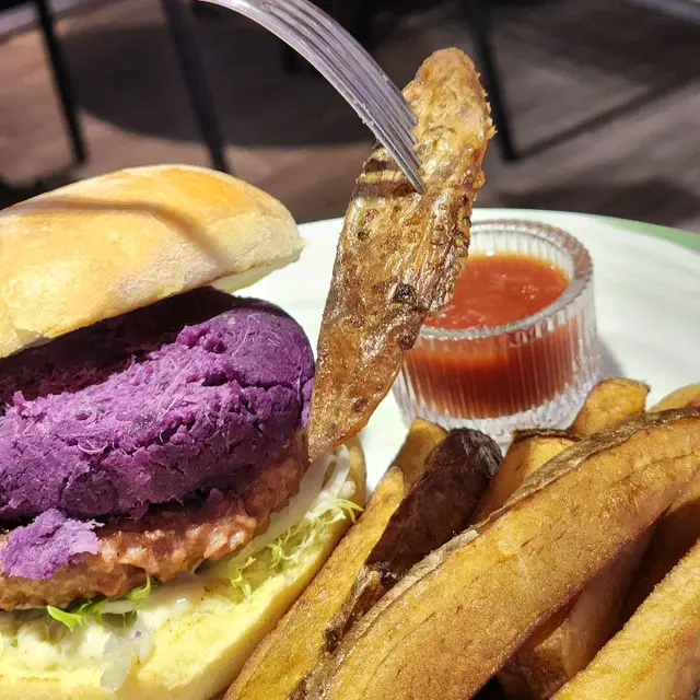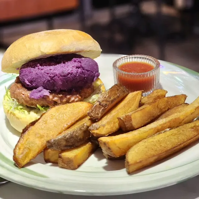 手工製作的麵包🥯鬆軟而實在,加上厚實的鮮甜紫薯及幾可亂真的素肉,味道完美配合,再配上厚切帶皮薯角,令人忍不住一口接一口。
