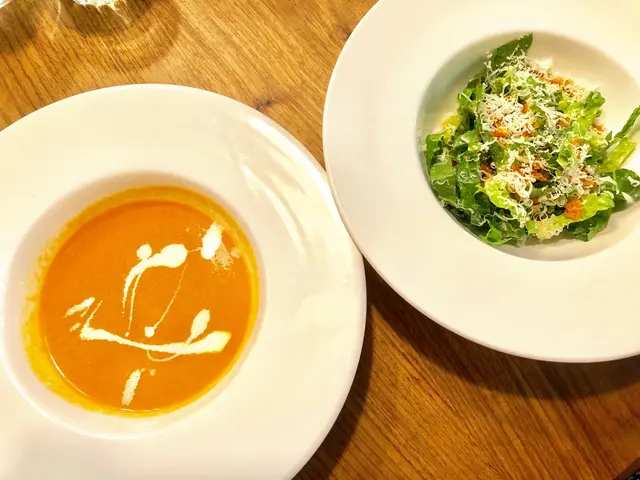 看起來簡單沒什麼特別的南瓜湯、凱薩沙拉,但魔鬼就藏在細節中,譬如凱薩沙拉上面撒著其實是先低溫烹煮再烘烤呈酥脆口感的鮭魚鬆,再撒上歐洲進口的起士,與一般直接淋上沙拉醬做法不同。