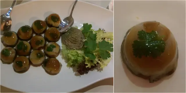 上湯鮑魚凍每人有兩隻,上湯凍軟身冰凍帶甜,鮮鮑魚切片爽身帶鮮,兩種質感令人欲罷不能。
