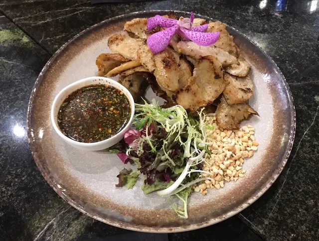炭燒豬頸肉堆配上小花生粒,豬頸肉肉質細嫩,配上椰糖芫茜辣汁,先一口甜味,後感辣味,食得好過癮。