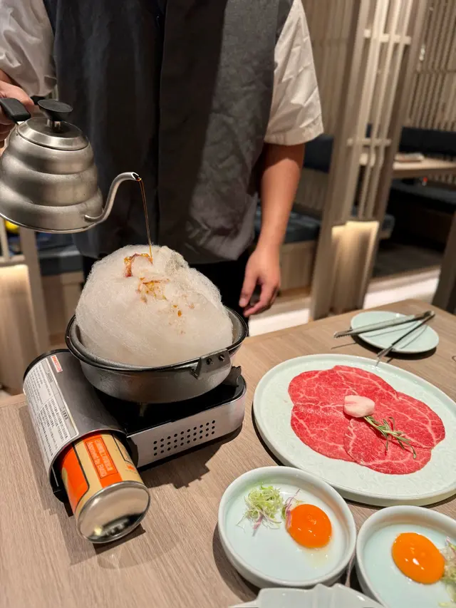 5片和牛砌成木槿花,店員全程會幫手煮呢個棉花糖壽喜燒鍋,見住棉花糖慢慢溶嘅過程好治癒,和牛煮完可以沾埋蛋漿一齊食更加滑嫩🥹